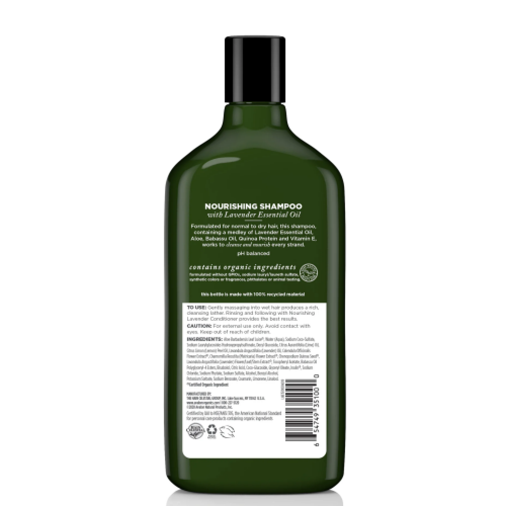 شامبو أفالون أورجانيكس باللافندر المغذي مصمم للشعر الجاف أو التالف، يرطب بعمق ويعزز النعومة واللمعان بتركيبة عضوية من زيت اللافندر، الصبار، الكينوا، الكاليندولا، وفيتامين E. معتمد من EWG وNSF، خالٍ من الكبريتات والبارابين، نباتي، وفي زجاجة معاد تدويرها. مثالي للشعر المصبوغ.