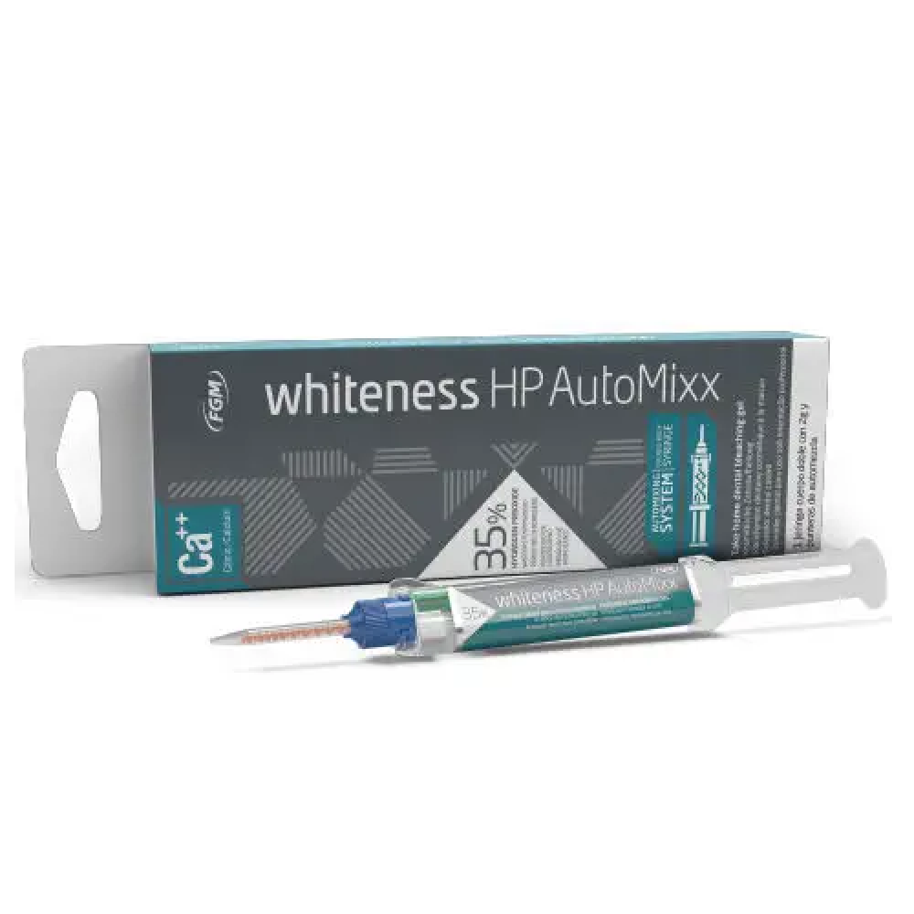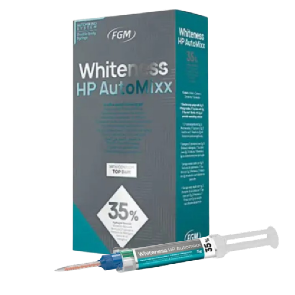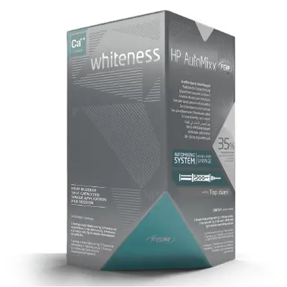 وايتنس إتش بي أوتوميكس 35% هو جل تبييض أسنان احترافي بتركيز 35% من بيروكسيد الهيدروجين، مصمم خصيصًا للاستخدام في عيادات الأسنان لتبييض الأسنان الحية وغير الحية. يتميز بنظام الخلط الذاتي (AutoMixx) الذي يتيح تحضير الجل بسهولة عبر طرف خلط ذاتي، مما يوفر الوقت ويقلل من هدر المواد. يحتوي الجل على الكالسيوم للحفاظ على صلابة مينا الأسنان، ويتمتع بدرجة حموضة محايدة ومستقرة تتيح تطبيقًا واحدًا لمدة تصل إلى 50 دقيقة دون الحاجة إلى استبداله، مع تقليل حساسية الأسنان. يشتمل المنتج على حاجز لثوي (Top Dam) قابل للتصلب بالضوء لعزل اللثة، ومحلول مزيل للحساسية (Desensibilize KF 2%) لضمان راحة المريض. يتميز الجل بلون أزرق-أخضر لا يتغير أثناء العملية، مما يسهل التحكم البصري، ويحتوي على حاجز حراري يمنع الحرارة من الوصول إلى لب السن عند استخدام مصادر الضوء.