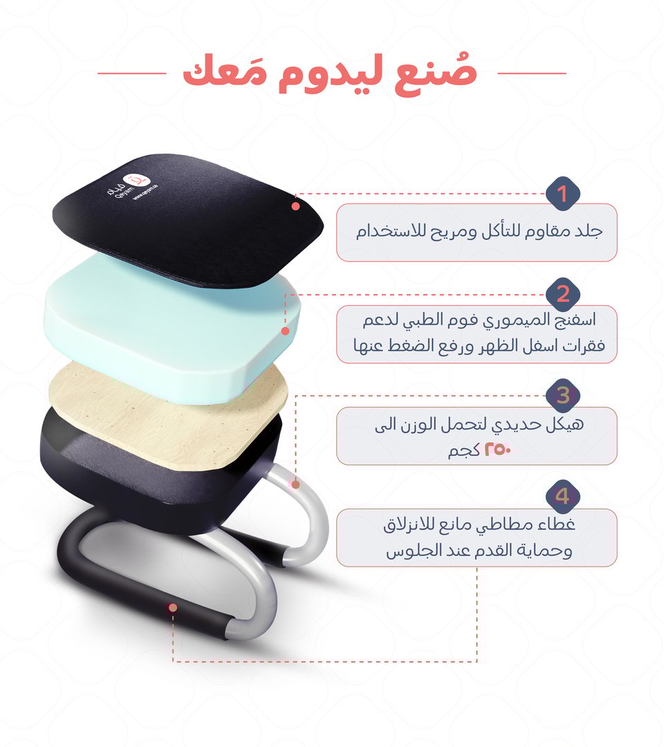 الكرسي لا يحتاج لضبط يدوي للارتفاع، بل يمكنك التحكم بزاوية الجلوس عبر تقديم الكرسي للأمام أو إرجاعه للخلف حتى تجد الزاوية المريحة لثني الركبة.